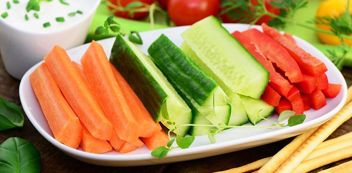 Marchewki, kalarepy i paprykę dokładnie myjemy. Warzywa kroimy w słupki i układamy na talerzu. Ogórek obieramy, ścieramy na tarce o grubych oczkach i solimy. Po około 10-15 minutach odciskamy nadmiar wody, dodajemy jogurt, przeciśnięty przez praskę ząbek czosnku oraz drobno pokrojony koperek. Doprawiamy do smaku solą i pieprzem. Dip przekładamy do miseczki, a przed podaniem wstawiamy na pół godziny do lodówki.