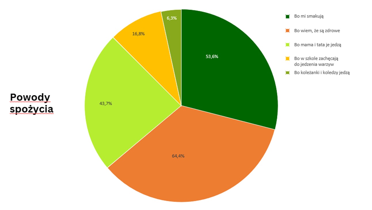 W przypadku warzyw 40% dzieci spożywa je raz dziennie, natomiast nawet 13% twierdzi, że nie je ich wcale. W przypadku warzyw jednak nieco inaczej wyglądają przyczyny ich spożywania. O ile owoce zjadane są najczęściej dla smaku, w przypadku warzyw największe znaczenie ma fakt, że są po prostu zdrowe (ich smak jest drugą w kolejności przyczyną). Z kolei podobnie jak w przypadku owoców, duże znaczenie ma również fakt jedzenia warzyw przez rodziców (poziom wpływu jest podobny jak w przypadku owoców).